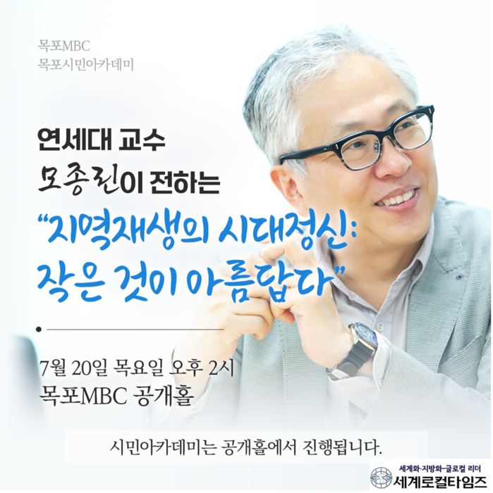 [세계로컬타임즈 김명진 기자] 목포시와 목포MBC가 공동 주최하고 있는 목포시민 아카데미 강좌가 오는 20일 오후 목포MBC 공개홀에서 개최된다.