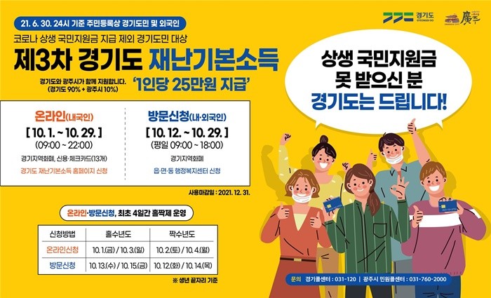 [세계로컬타임즈 김진오 기자] 경기 광주시는 정부가 지급하는 상생 국민지원금 대상에서 제외된 광주시민 5만3,378명을 대상으로 오는 10월 1일부터 ‘제3차 경기도 재난기본소득’ 신청을 받는다고 27일 밝혔다.