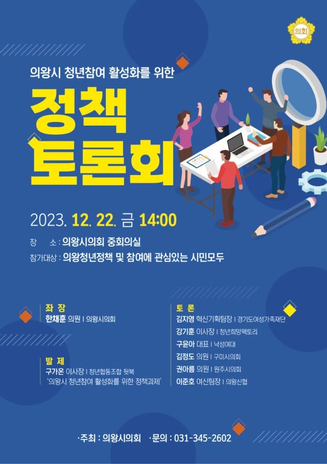 [세계로컬타임즈 이종화 기자] 의왕시의회는 오는 22일 오후 2시 시의회 중회의실에서 ‘의왕시 청년참여 활성화를 위한 정책토론회’를 개최한다.
