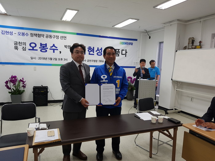 [세계로컬신문 김수진 기자] 오봉수 더불어민주당 금천구청장 예비후보가 2일 김현성 더불어민주당 금천구청장 전 예비후보와 정책협약 공동구정 선언 협약식을 열었다.