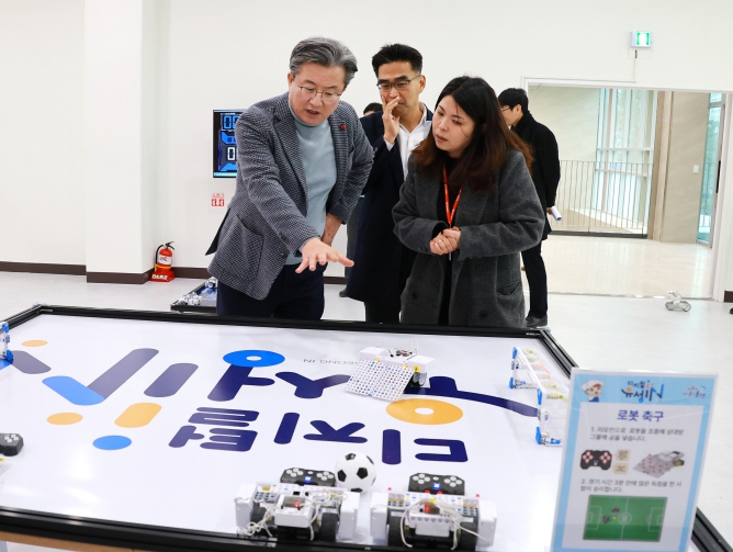 정용래 유성구청장이 지난 2월 개관한 용산도서관의 디지털전환(DX)지원센터를 점검하고 있다.