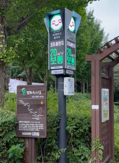 평화누리길 기반시설 보강사업의 일환으로 설치된 미세먼지 신호등은 한국환경공단의 실시간 대기질 정보를 연동해, 좋음(파랑)·보통(초록)·나쁨(노랑)·매우나쁨(빨강) 등 4단계 색상으로 대기 상태를 직관적으로 표시한다.