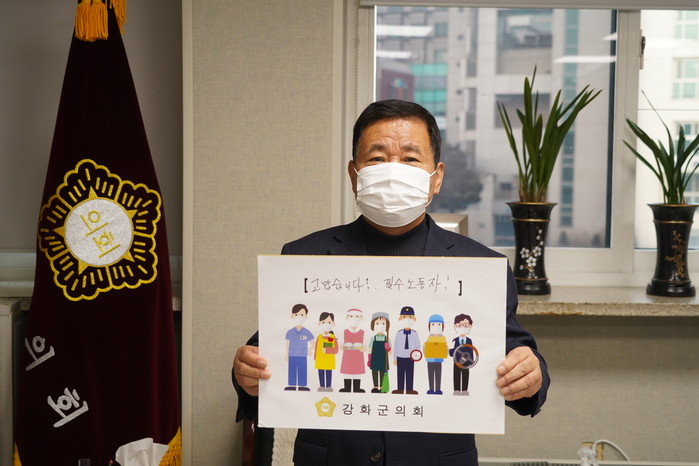 [세계로컬타임즈 유영재 기자] 신득상 강화군의회 의장은 코로나19 상황에도 대면 노동이 불가피한 업무를 진행하는 필수노동자들에게 감사와 응원의 메시지를 전하는 ‘고맙습니다, 필수노동자’ 릴레이 캠페인에 동참했다.