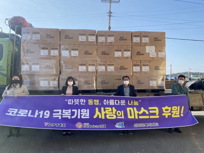 이날 전달받은 사랑의 물품은 LG생활건강, 영실업, 장원교육, ㈜톱텍에서 후원받은 총 2억원 상당의 샴푸, 치약 등 생필품, 어린이장난감, 어린이 도서, 미국FDA와 유럽연합 CE 인증제품인 에어퀸 나노마스크 12만 8천장으로 이는, 신안군복지재단를 통해 사회복지시설 및 어려움을 겪고 있는 관내 주민 등 적재적소에게 신속하게 전달할 예정이다.