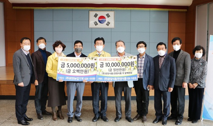 | ▲㈜광일식품·㈜한영식품 조문호 대표 1000만원 희망농업기계㈜ 이리중 대표 500만원 기탁(사진=나주시) |