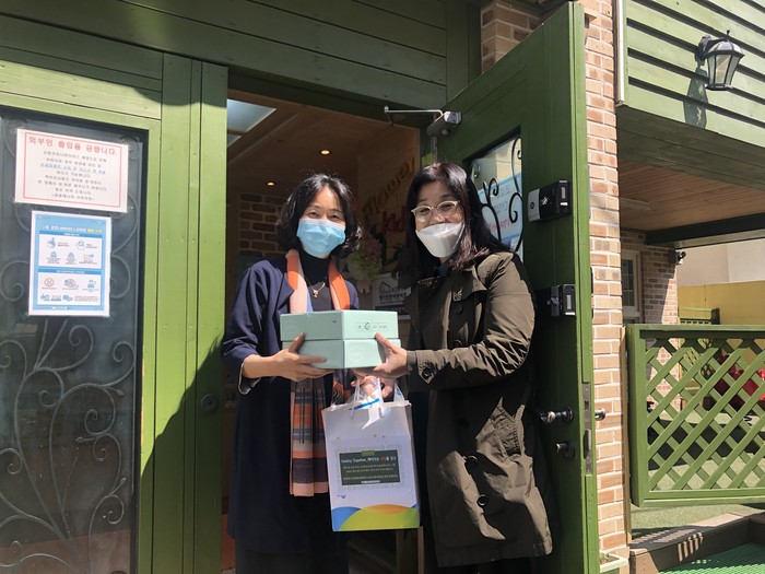 | ▲ 계양구육아종합지원센터 관계자가 코로나19로 장기간 정상운영을 하지 못하는 어린이집을 응원하기 위해 케이크를 전달하고 있다. (사진=계양구청 제공) |