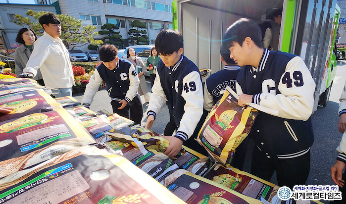 ▲14일 오전 전북기계공고 학생들이 기탁된 백미를 차량에 옮기고 있다. ⓒ조주연 기자 |