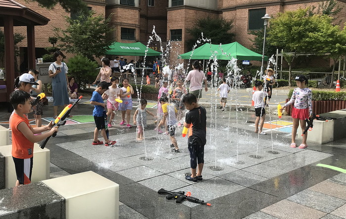 | ▲당진시는 공동주택 주민갈등을 줄이기 위한 '아파트 공동체 어울림' 사업을 추진한다. 사진은 아파트 주민 행사장에서 어린이들이 분수대에서 놀고 있는 모습. (사진=당진시 제공) |