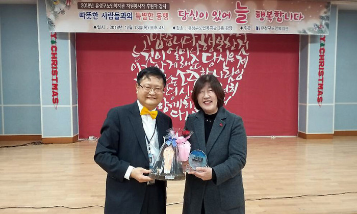 | ▲유성구의회 하경옥 의장(오른쪽)은 13일 유성구노인복지관에서 류재룡 관장에게서 노인복지사업을 위해 노력한 공로를 인정받아 감사패를 받았다. (사진= 유성구의회 제공) |