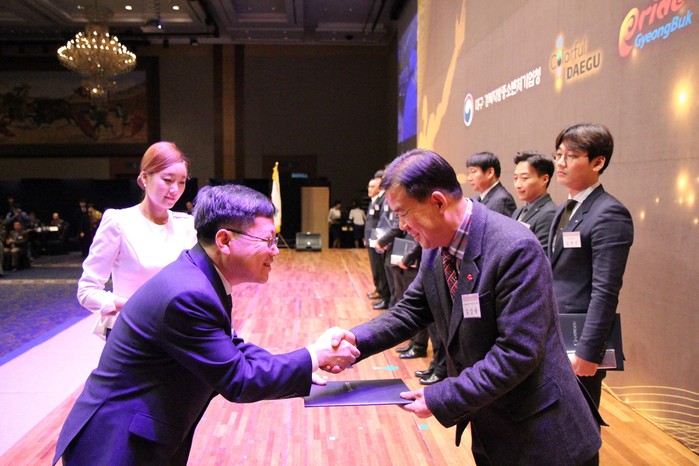 | ▲ 대구종합유통단지 전자상가사업협동조합 김상출 이사장이 지난달 27일 호텔인터불고 대구 컨벤션홀에서 열린 ‘2017 대한민국 중소기업인 대회’에서 중소벤처기업부장관상을 수상하고 있다. |