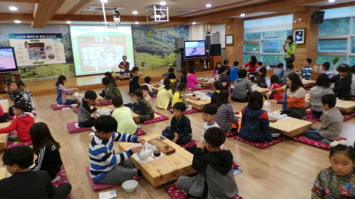 ▲ 경남 하동군 화개초등학교 학생들이 25일 하동차문화센터에서 다례 체험교육을 받고 있다. <사진제공=하동군청> |