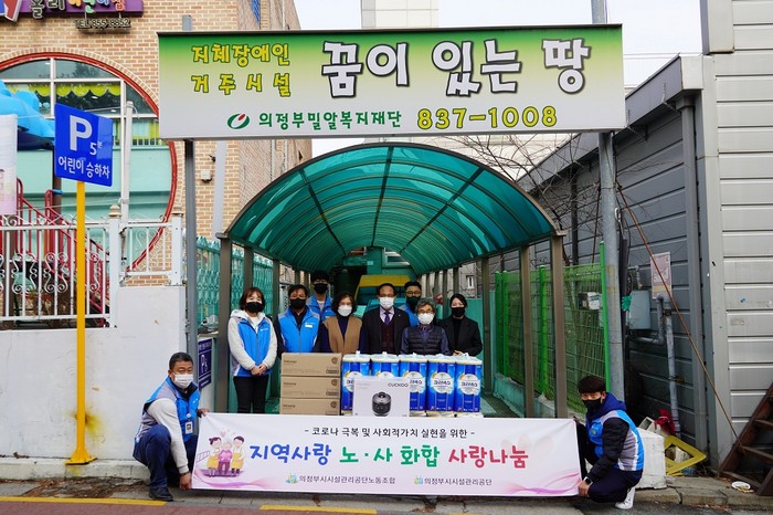 [세계로컬타임즈 한기선 기자] 의정부시시설관리공단(이사장 임해명)과 노동조합(위원장 유홍재)은 코로나19로 어려움을 겪고 있는 이웃을 위해 노사 공동으로 생활물품 등을 전달하는 사랑 나눔 행사를 실시했다.