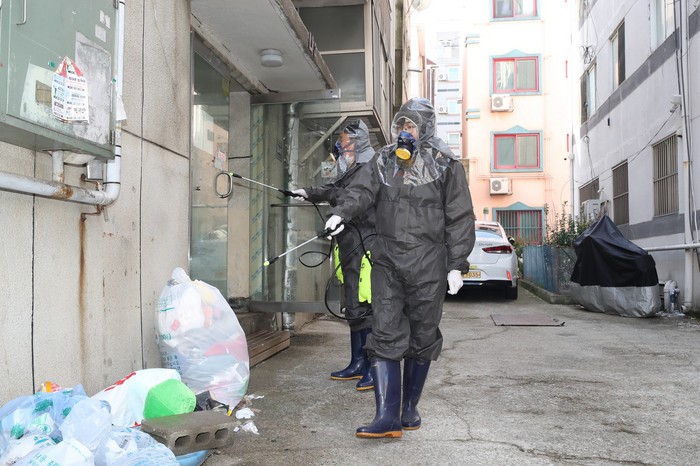 | ▲ 인하대에서 중국인 유학생들이 밀집해있는 자취방 주변에 방역작업을 실시하고 있다. (사진=인하대 제공) |