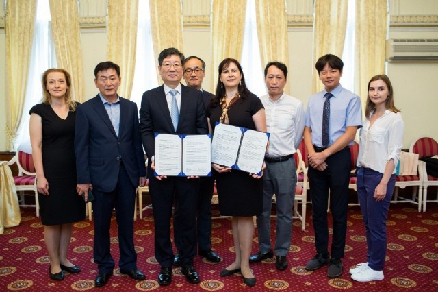 | ▲ 부산 해운대백병원 관계자들이 러시아 블라드마마 그룹과 보건의료 업무협약을 체결한 후 기념촬영하고 있다.<사진제공=해운대백병원> |