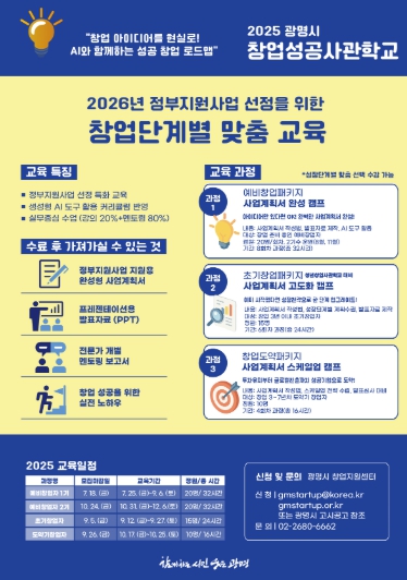 [세계로컬타임즈] 광명시는 2026년 정부지원사업 선정을 준비하는 예비·초기·도약기 창업자를 대상으로 ‘2025 광명시 창업성공사관학교’ 교육생을 모집한다고 3일 밝혔다.