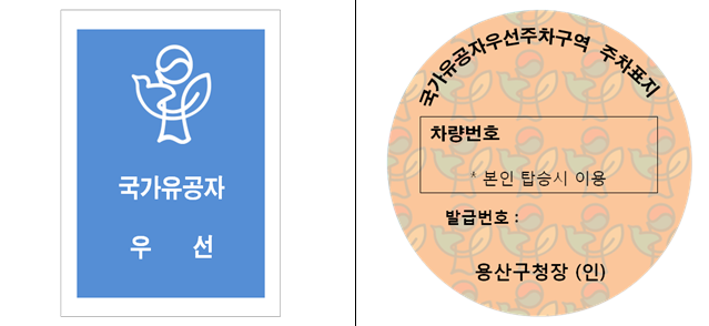 | ▲ 국가유공자 우선주차구역 구획선 도안과 주차표지. <사진제공=용산구청> |