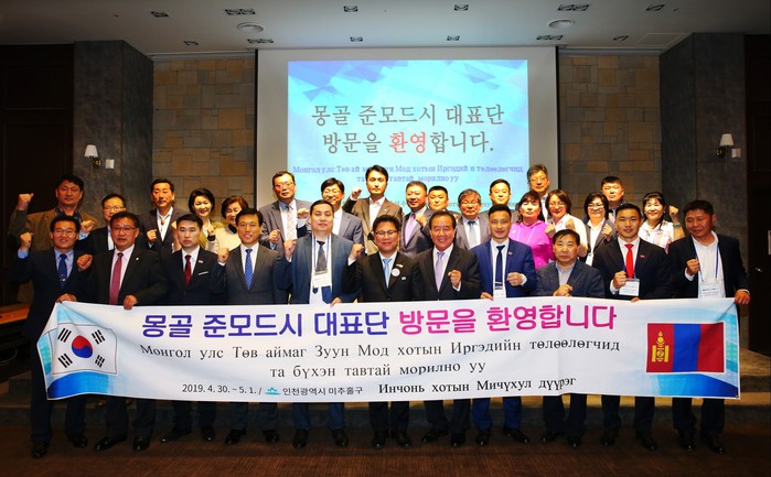 | ▲ 몽골 준모드시 대표단이 인천 미추홀구를 방문해 기념촬영을 하고 있다.(사진=미추홀구 제공) |