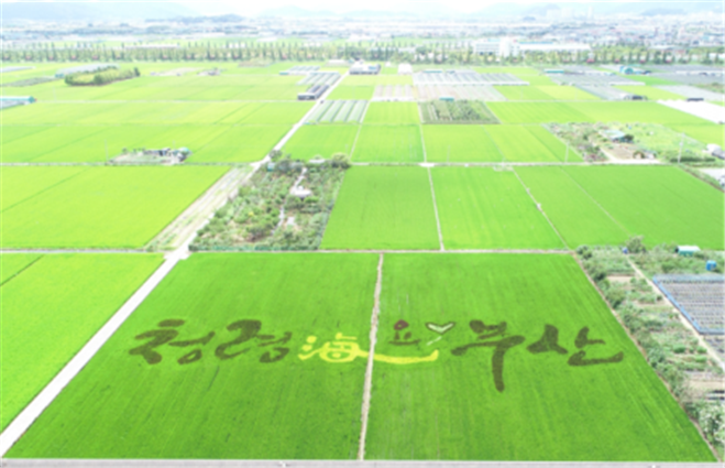 13일 부산시에 따르면 이 들녘캔버스는 부산시농업기술센터가 강서구 대저동 들녘일대에 색깔있는 벼를 활용해 98m×89m 면적의 ‘청렴海요~♥부산’ 논그림을 조성한 것이다.