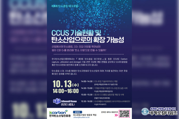 포럼은 ‘CCUS 국내·외 기술현황 및 탄소산업으로의 확장가능성’을 주제로 국내외 CCUS기술현황을 공유하고 이산화탄소의 자원화를 통한 탄소산업과 연결점을 살펴보는데 초점이 맞춰질 예정이다.