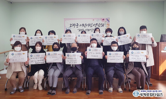[세계로컬타임즈 조주연 기자] 전북 고창군 어린이집연합회가 지난 16일 고창군 육아종합지원센터에서 월례회의를 진행한 가운데 ‘2023 세계유산도시 고창 방문의 해’ 성공추진을 기원하는 응원하는 문구를 직접 적고 구호를 외치며 결의를 다지고 있다. 고창군은 어린이집과 지역아동센터 통학차량 38대에 홍보 스티커를 제작·배부하여 고창방문의 해를 적극 홍보할 예정이다.