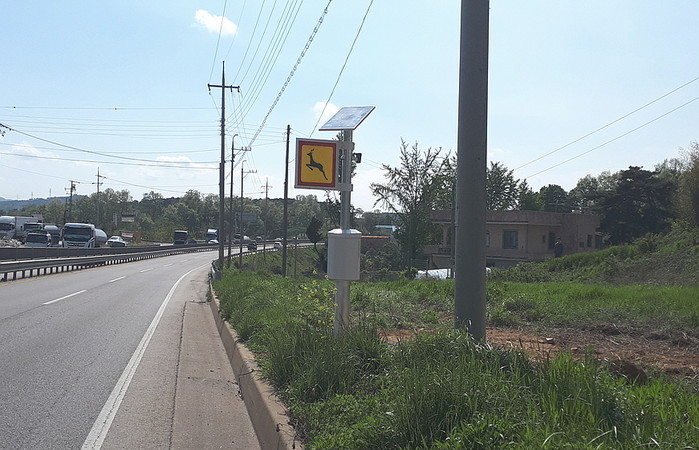 | ▲ 도로변에 야생동물 출현 알림판을 통해 운전자의 서행을 유도하는 기능이 있는 로드킬 방지 시스템이 설치 돼 있다. <사진제공=당진시> |