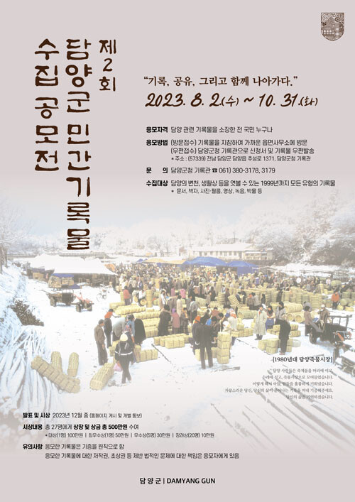 담양군 관계자는 “담양의 과거와 미래를 잇는 의미 있는 기록물 수집 공모전에 많은 분들의 참여와 공유를 부탁드린다”고 말했다.