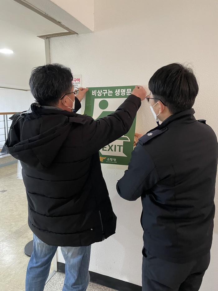 | ▲강화소방서 관계자가 다중이용업소를 찾아 비상구는 생명문이다라는 포스터를 부착하고 있다. (사진=강화소방서 제공) |