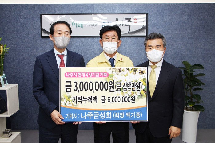 나주시는 8일 ‘나주 금성회’에서 인재육성기금 300만 원을 나주교육진흥재단에 기탁했다고 밝혔다. 이날 시장 집무실에서 진행된 기금 전달식에는 강인규 시장과 나주금성회 백기종 회장, 이병규 사무총장 등 회원 5명이 참석한 가운데 지역 교육 발전과 인재육성기금 등에 관한 환담이 오고 갔다.
