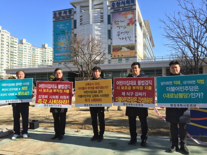 시위 참가자들은 성명서를 통해 “김영희 오산시의회 부의장은 2014년 제7대 오산시의회 민주당 비례대표로 시절 오산시 궐동 소재 자신 소유의 어린이집 대표직을 유지한 이래 2018년 6월 제8대 지방선거에서 시의원으로 당선된 이후에도 어린이집 대표직을 계속 맡아오다 지난 11월6일에서야 뒤늦게 대표직을 사퇴한 사실이 확인됐다”면서 “또한 2013년 10월부터 다음해 3월까지 자신의 어린이집 자금 1000만원을 건물융자금 원금상환에 사용해 오산시로부터 부적절한 회계처리에 따른 개선명령을 받은 사실도 명백히 드러났다”고 밝혔다.