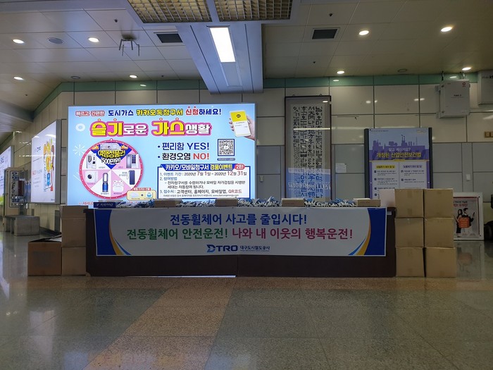 대구 1호선 반월당역 · 2호선 용산역 · 3호선 청라언덕역에서 실시된 이번 캠페인은 코로나19 확산 방지를 위해 비대면 방식으로 진행, 해당 역사에 ‘보행보호용 의자차 안전이용’ 현수막을 부착하고 시민 배부용 홍보 부채와 물티슈가 비치된 무인 진열대를 설치했다.