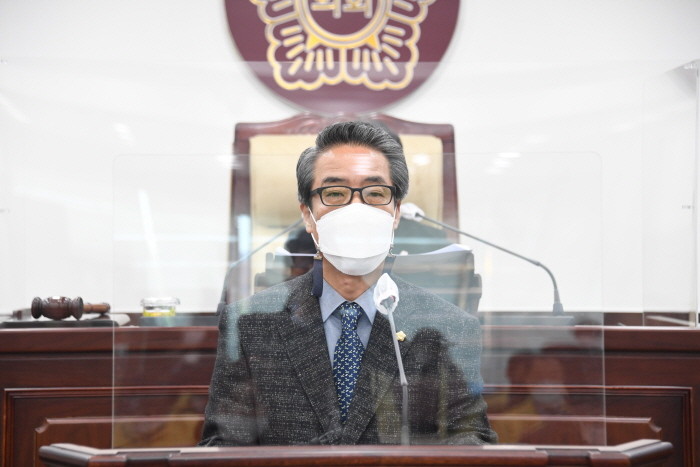 | ▲ 김승호 의원이 '어수로 확장사업 관련 세금감면 혜택 미공지 지적' 5분 자유발언을 하고 있다.(사진=시의회 제공) |