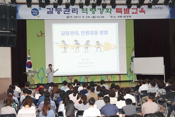 | ▲ 서울시 관악구가 지난 26일 민원 담당공무원 등 직원 350여명를 대상으로 갈등관리 역량강화 교육을 진행하고 있다.<사진제공=관악구청> |