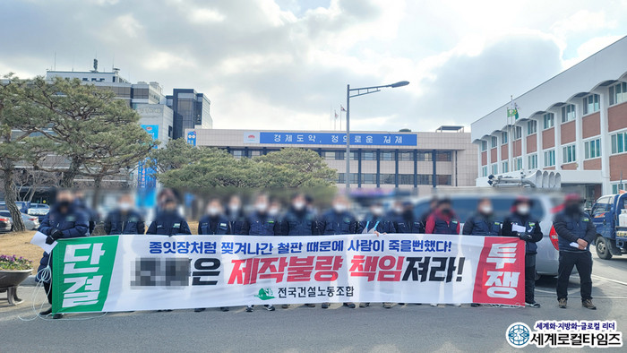 [세계로컬타임즈 글·사진 조주연 기자] 전국건설노동조합 광주전남건설기계지부가 12일 오후, 전북 김제시청 앞에서 이 지역에 소재한 한 특장차 제조기업의 “크레인 제작불량으로 인해 사고가 발생했지만, 보증기간이 끝났다는 이유로 책임을 회피하고 있다”며 기자회견을 갖고 있다.