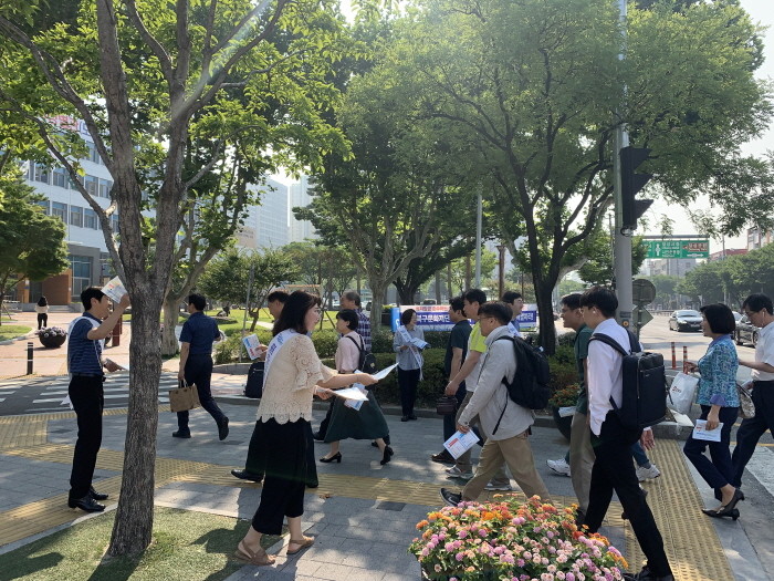 | ▲ 북구청 감사실 직원 및 청렴리더들이 전단지를 돌리고 있다. (사진=대구 북구 제공) |
