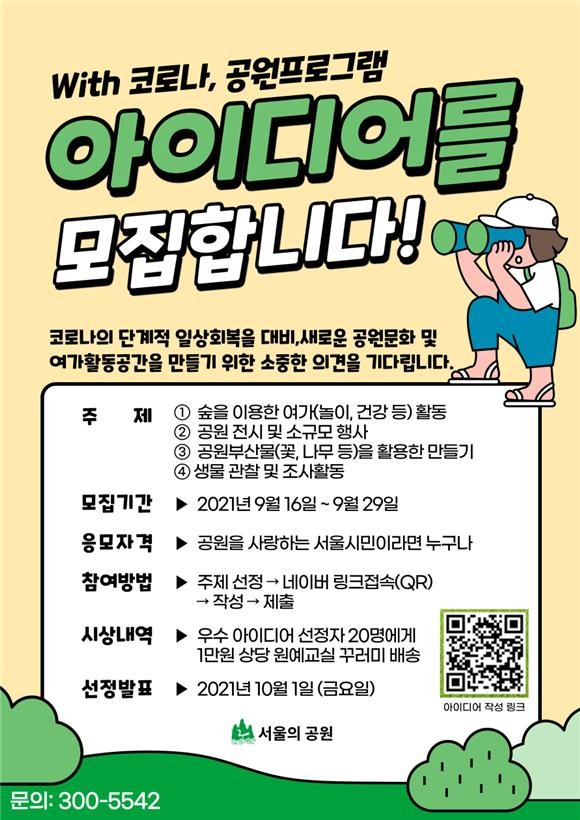현재 운영 중인 비대면 프로그램과 함께 사회적 거리두기를 준수하면서 공원에서 재미있게 즐길 수 있는 대면 프로그램 아이디어를 16일부터 29일까지 모집한다.