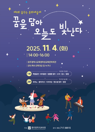 광주시교육청은 오는 11월 4일 오후 2시 시교육청학생교육문화회관에서 특수교육대상학생이 펼치는 ‘제9회 꿈꾸는 문화예술제’를 개최한다.