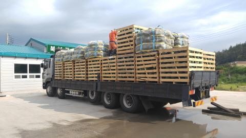 ▲ 전남 신안군에서 해풍을 맞고 자란 단호박을 일본으로 수출하기 위해 관계자가 트럭에 싣고 있다.<사진제공=신안군청> |