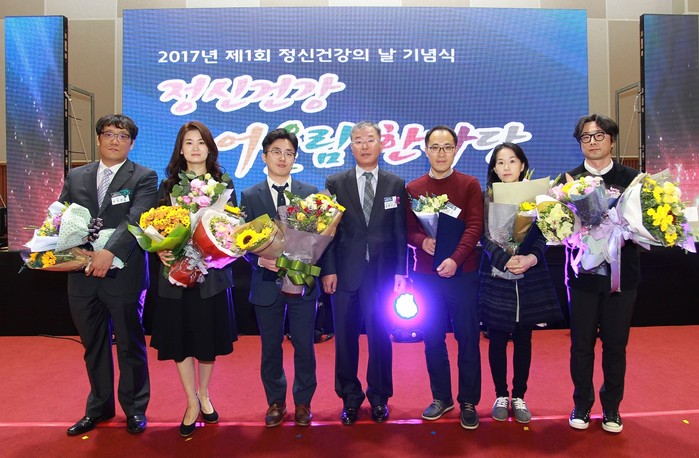 | ▲17일 대전 한밭체육관에서 열린 ‘제1회 정신건강의 날 기념 행사’에서 김택수 대전시 정무부시장(가운데)이 정신건강증진과 정신장애인에 대한 인식개선에 기여한 공로자들과 기념촬영하고 있다. <사진제공=대전시청> |