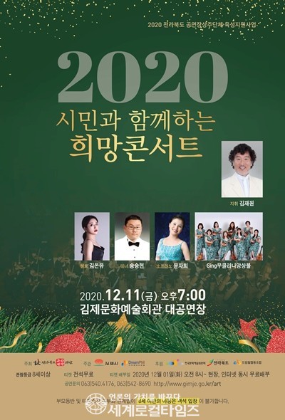 [세계로컬타임즈 조주연 기자] 전북 김제시가 내달 11일 김제 시민과 함께하는 ‘2020 희망 콘서트’를 김제문화예술회관 무대에 올린다.
