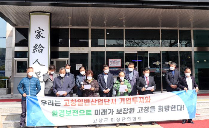 이기환 연합회장은 “수년 전 고수면 일원 산업단지 개발 소식을 시작으로 시공사와의 마찰로 인한 장기간의 법정 다툼, 최근들어 유치권해소와 입주계약 체결 등 고창일반산업단지와 관련한 일련의 과정을 지켜보면서 잘 되기를 바라는 마음 뿐”이라고 말했다.