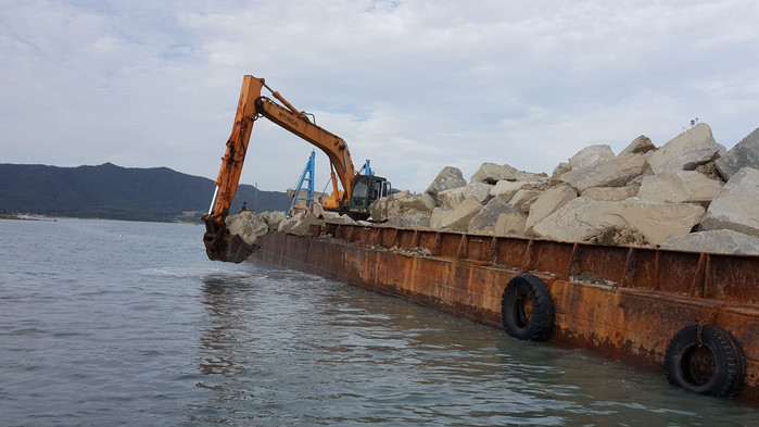 | ▲ 송지면 통호해역에 해삼서식용 자연석을 넣어 가라 앉히고 있는 모습 (사진제공:해남군청) |