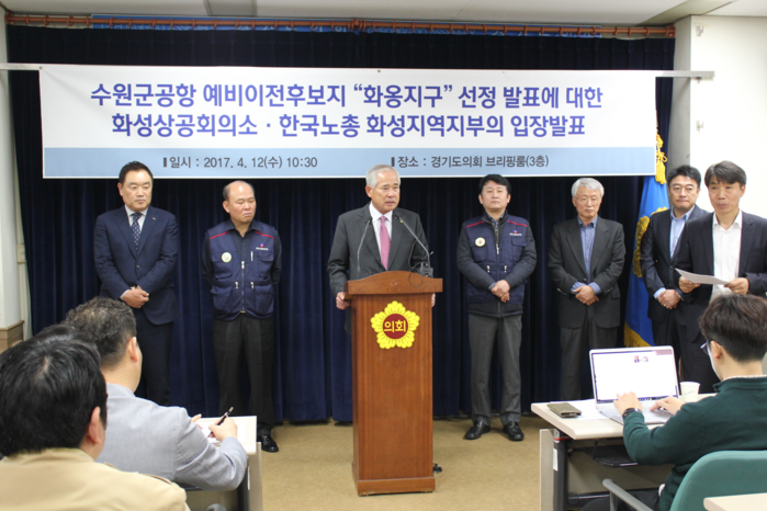 [세계로컬신문 최원만 기자] 화성상공회의소(회장 최주운)와 한국노총 화성지역지부(의장 김덕수)는 12일 경기도의회 브리핑룸에서 수원 군공항 예비 이전 후보지 화옹지구 선정에 반대하는 성명서를 발표했다.