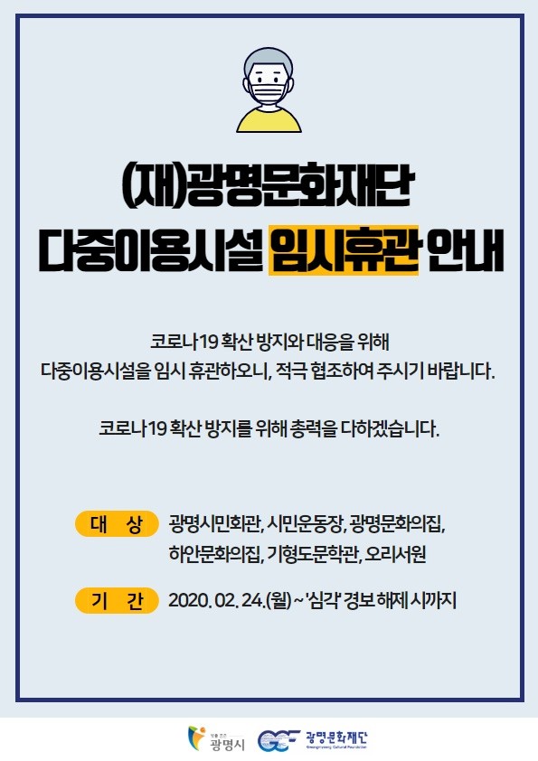 광명문화재단 임철빈 대표는 “시민 안전을 위해 부득이 휴관을 결정하게 됐다”며 “상황이 종료될 때가지 감염증 확산 방지에 광명문화재단도 적극 동참해 시민들이 다시 안심하고 이용할 수 있도록 정비하겠다”고 말했다.