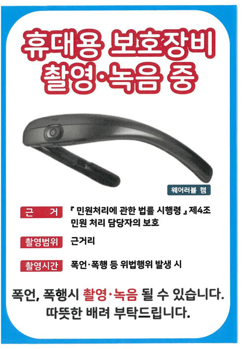 목걸이 형태의 웨어러블 캠은 전‧후방 촬영과 녹음이 가능한 기기로 민원인의 폭언‧폭행 발생 시 고지 후 제한적으로 사용하게 되며 근거자료로 활용된다.
