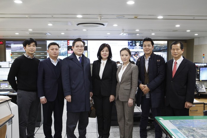 | ▲ 이갑규 본부장(오른쪽 첫번째)와 비암바수렌 람자브(L.BYAMBASUREN) 몽골 보건부 차관(가운데)이 119종합상황실을 방문하고 기념촬영하고 있다. |