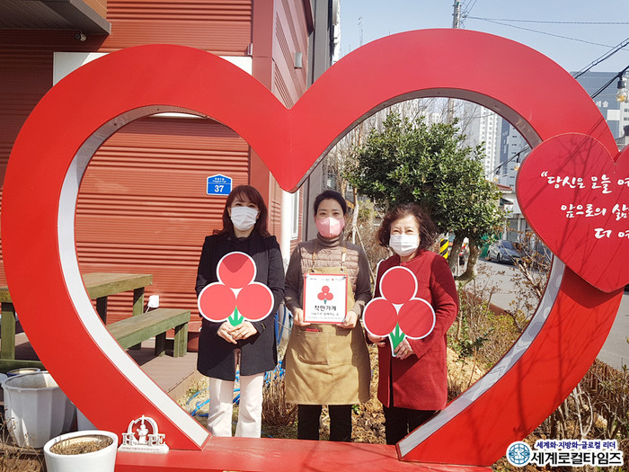 | ▲지난 16일 예쁘오카페에 착한가게 28호점 현판을 전달하고 기념촬영을 하고 있다 ⓒ군산시 |