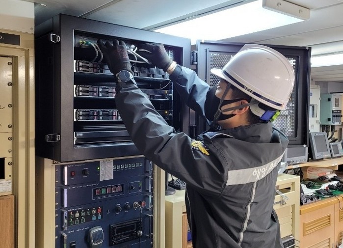 | ▲서해지방해양경찰청 소속 경찰관이 함정 내 재난안전통신망 안정화 작업을 하고 있는 모습.(사진=서해지방해양경찰청) |