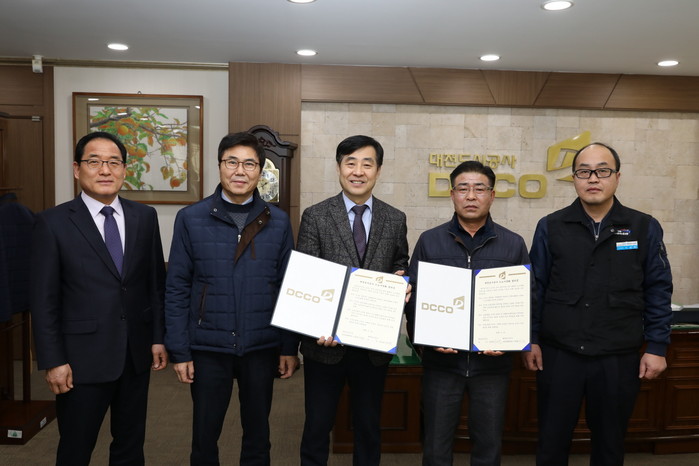 | ▲(왼쪽부터)대전도시공사 백명흠 사업이사, 최규관 경영이사, 유영균 사장, 이종희 공무직노조위원장, 이용혁 사무직노조위원장 등 노사대표들이 신노사문화 정착 결의문에 서명하고 기념촬영하고 있다. |