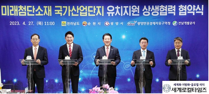 [세계로컬타임즈 김명진 기자] 전라남도는 27일 광양만권경제자유구역청 회의실에서 순천시, 광양시와 이차전지, 수소, 기능성 화학 등 미래소재 산업 육성을 위한 ‘미래첨단소재 국가산업단지 지정 상생협력 업무협약’을 맺었다.