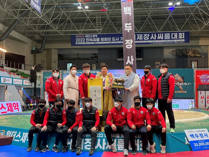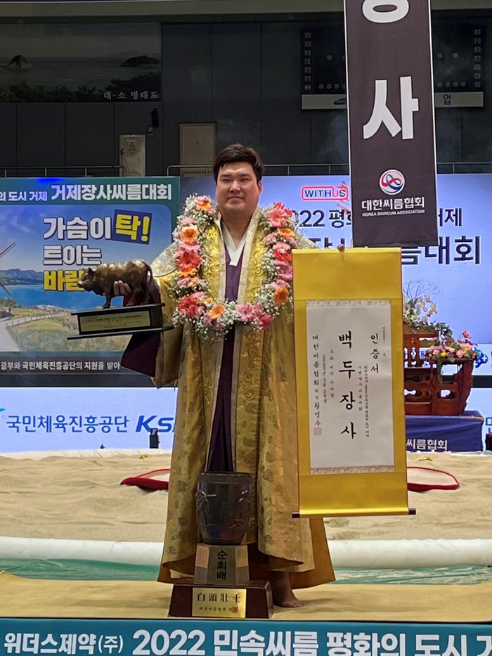 [세계로컬타임즈 강석운 기자] 경남 거제시에서 열린 ‘거제장사씨름대회’에서 영암군민속씨름단 윤성민이 백두장사에 올라 1년 4개월만에 백두장사 타이틀을 거머쥐었다.